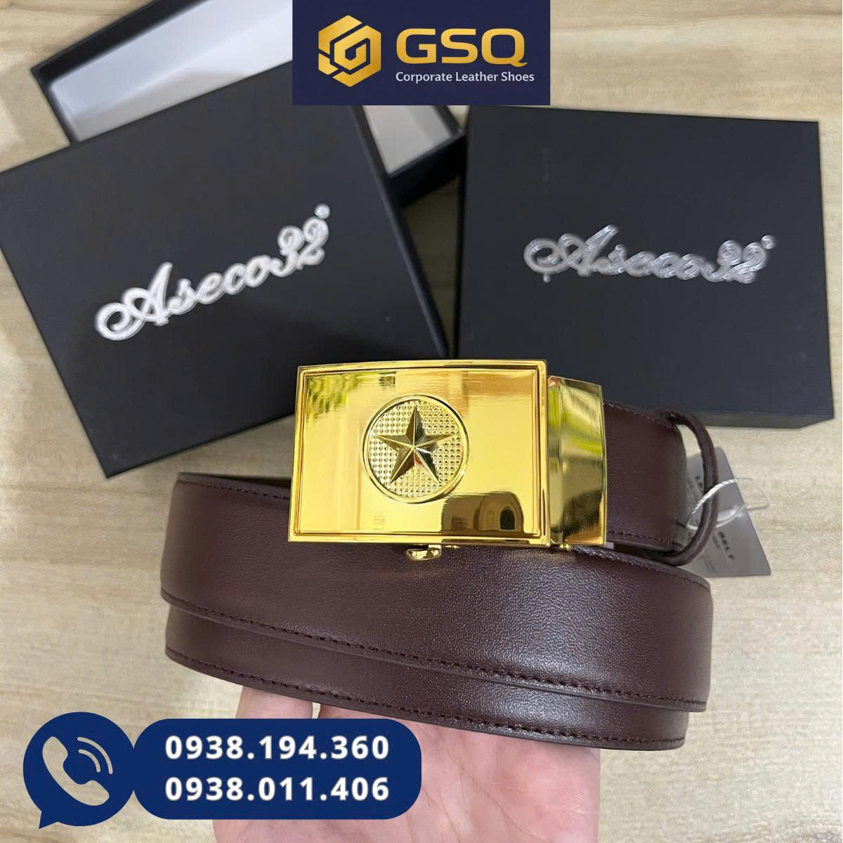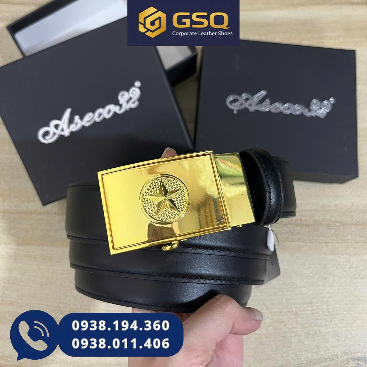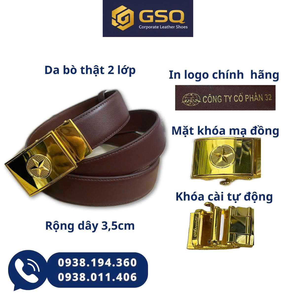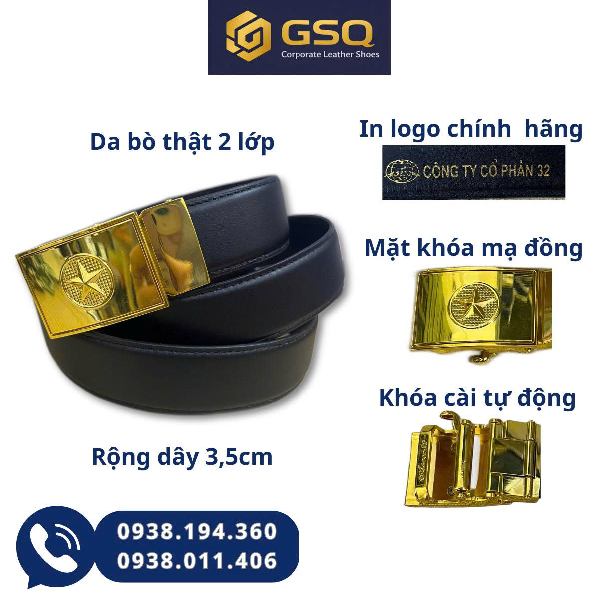 Dây nịt GSQ được trang bị mặt khóa kim loại mạ đồng cao cấp, bề mặt sáng bóng, hạn chế trầy xước. Thiết kế khóa vuông mạnh mẽ, tạo điểm nhấn nam tính, dễ phối với quần tây, quần kaki hay jean.