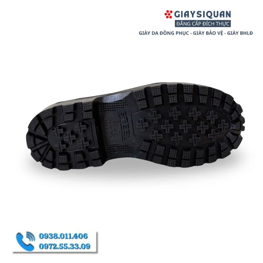 Đế giày được làm từ cao su nguyên khối chống đinh, có rãnh sâu giúp tăng độ ma sát, chống trơn trượt trên sàn ướt hoặc trơn. Đảm bảo an toàn khi làm việc trong môi trường dầu, nước hoặc bụi bẩn.